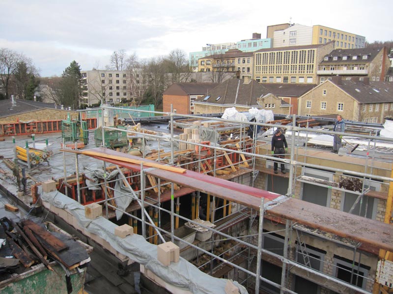Im Zuge des Umbaus eines historischen Bürogebäudes – Teil eines denkmalgeschützten Hofensembles – in ein modernes Holding-Gebäude entstand ein neuer Innenhof, bei dem im historischen Bestand neue Bauelemente wie Treppenhäuser und ein Aufzugsschacht integriert wurden.