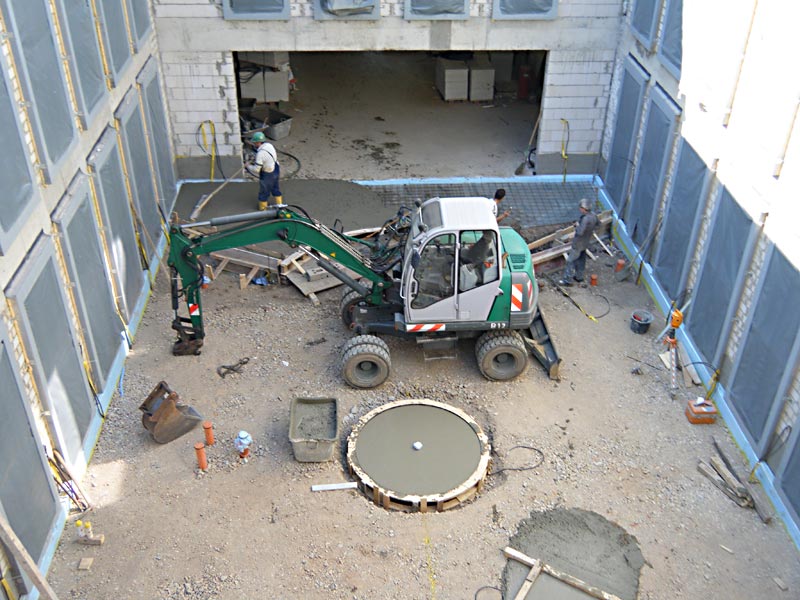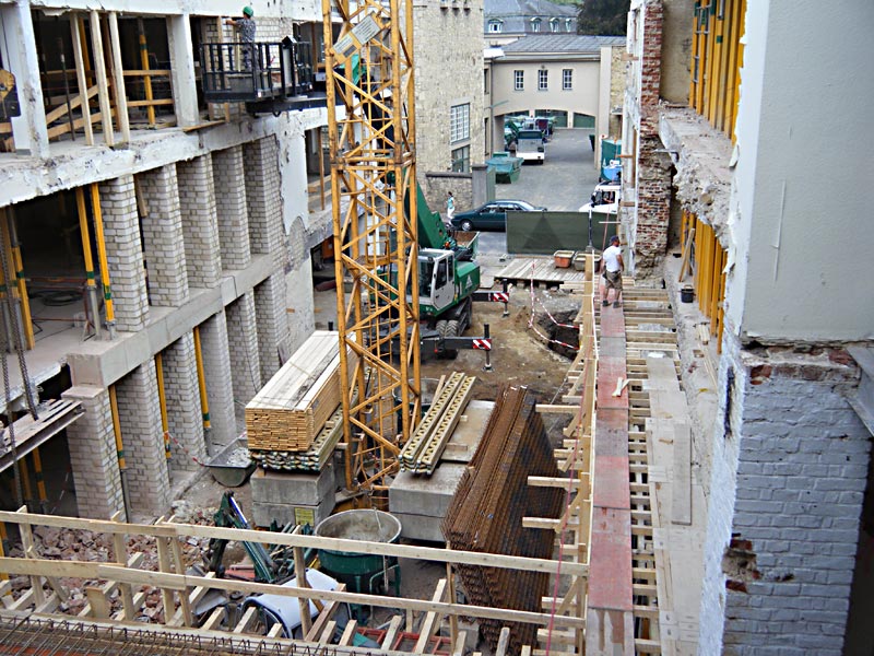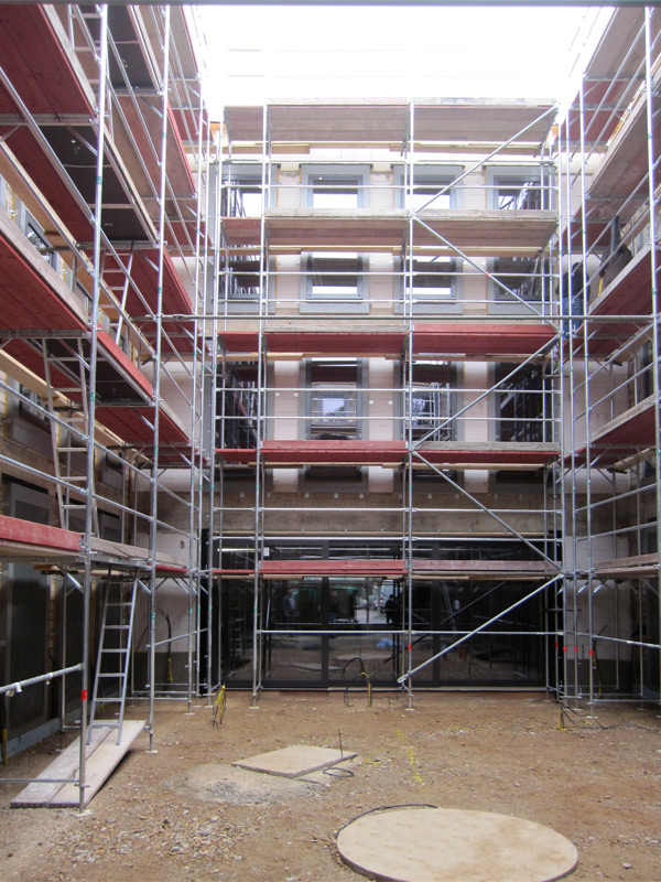 Im Zuge des Umbaus eines historischen Bürogebäudes – Teil eines denkmalgeschützten Hofensembles – in ein modernes Holding-Gebäude entstand ein neuer Innenhof, bei dem im historischen Bestand neue Bauelemente wie Treppenhäuser und ein Aufzugsschacht integriert wurden.
