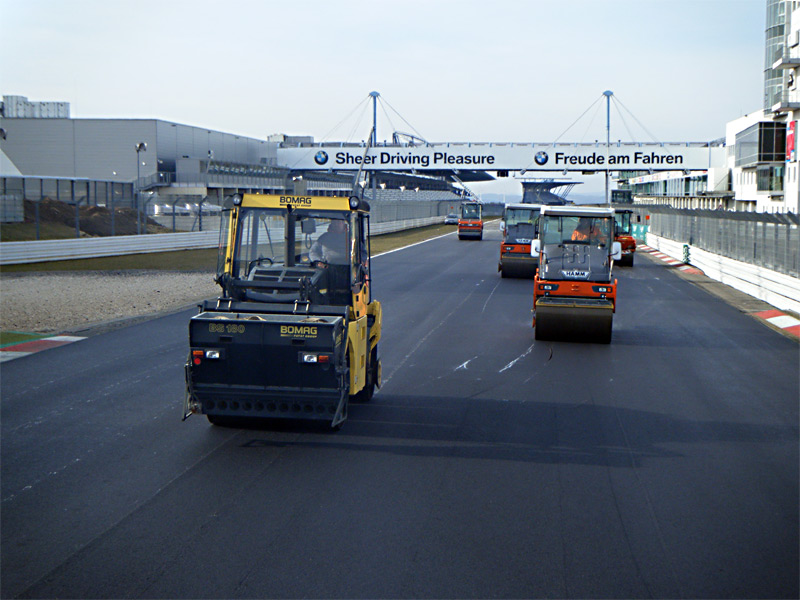 Gemeinsam mit Partnerunternehmen haben wir dieses Formel-1-Projekt in Angriff genommen: die Erneuerung der Asphaltdecke auf dem Nürburgring. Wo normalerweise die Schumachers, Vettels und Rosbergs starten, wetteiferten diesmal die Asphaltwalzen der verschiedenen Teams in die Pole Position …